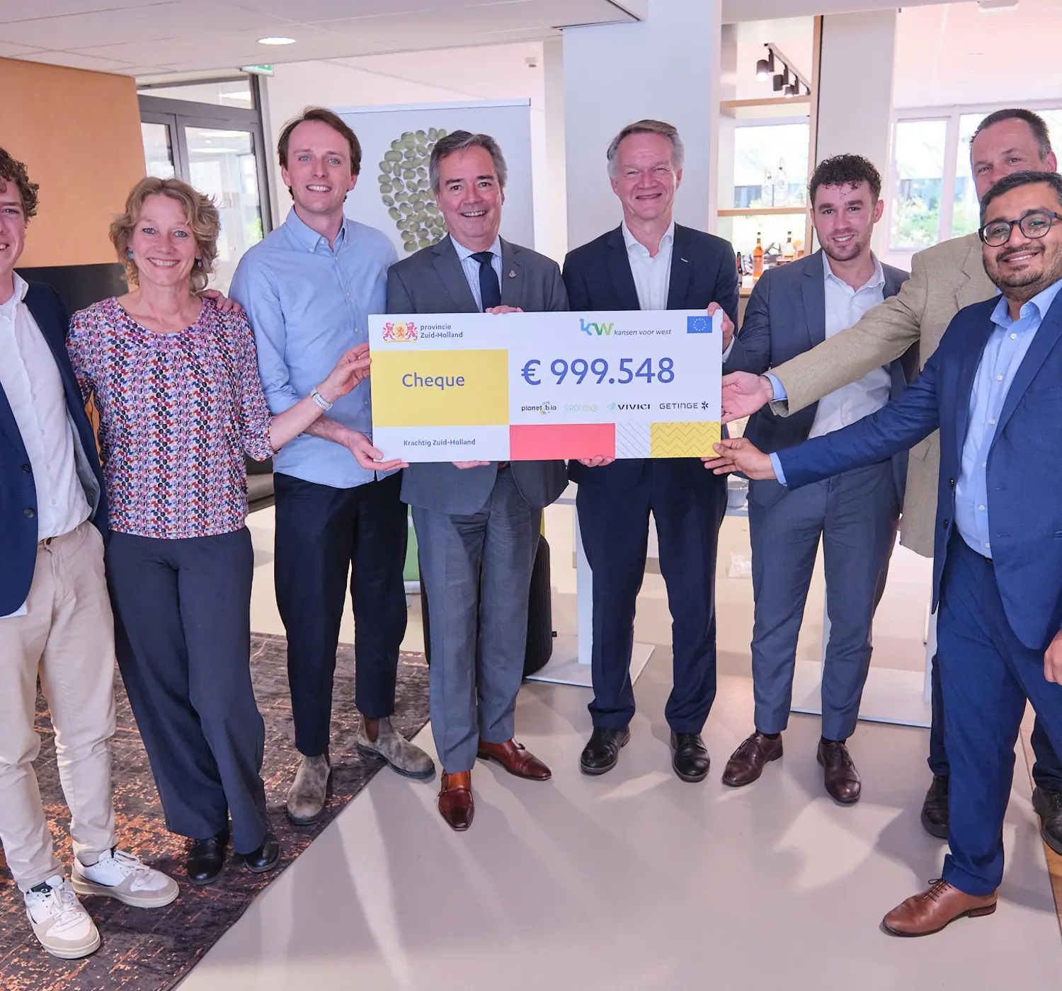 During a celebratory event on Friday, April 11, at Planet B.io in Delft, Meindert Stolk, Regional Minister for Economy and Innovation of the Province of South Holland, awarded a ~€1 million subsidy cheque to the EGGcellent project. This regional innovation initiative brings together the innovative companies Vivici, Proeon and Applikon, along with Planet B.io, which will focus on developing a sustainable, vegan alternative to chicken eggs, specifically for use in the bakery industry. The funding comes from the “Kansen voor West III” program, supported by the European Regional Development Fund (ERDF).