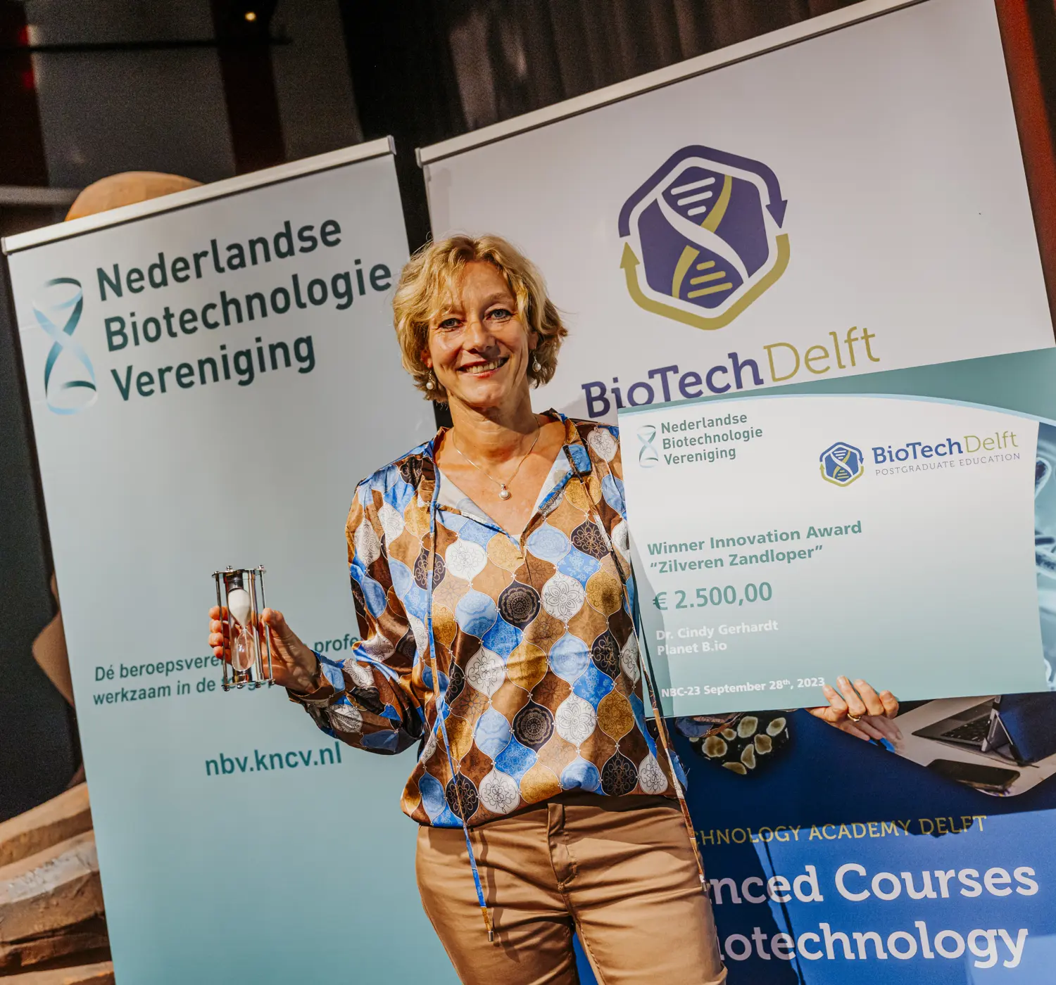 On 29 September 2023, Cindy Gerhardt was awarded the Zilveren Zandloper for her instrumental role in developing and strengthening the start-up ecosystem in industrial biotechnology in the Netherlands in the past few years.
